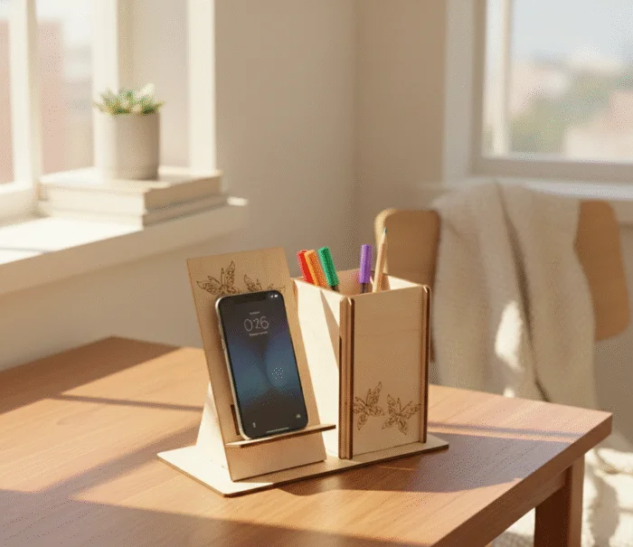 Made entirely from high-quality MDF (Medium-Density Fibreboard), this piece features a smooth natural wood finish that suits modern, minimalist, and everyday interiors. The phone stand holds your smartphone at a comfortable viewing angle for hands-free calls, video watching, or notifications. The attached pen holder provides convenient space for pens, pencils, markers, or small stationery items.