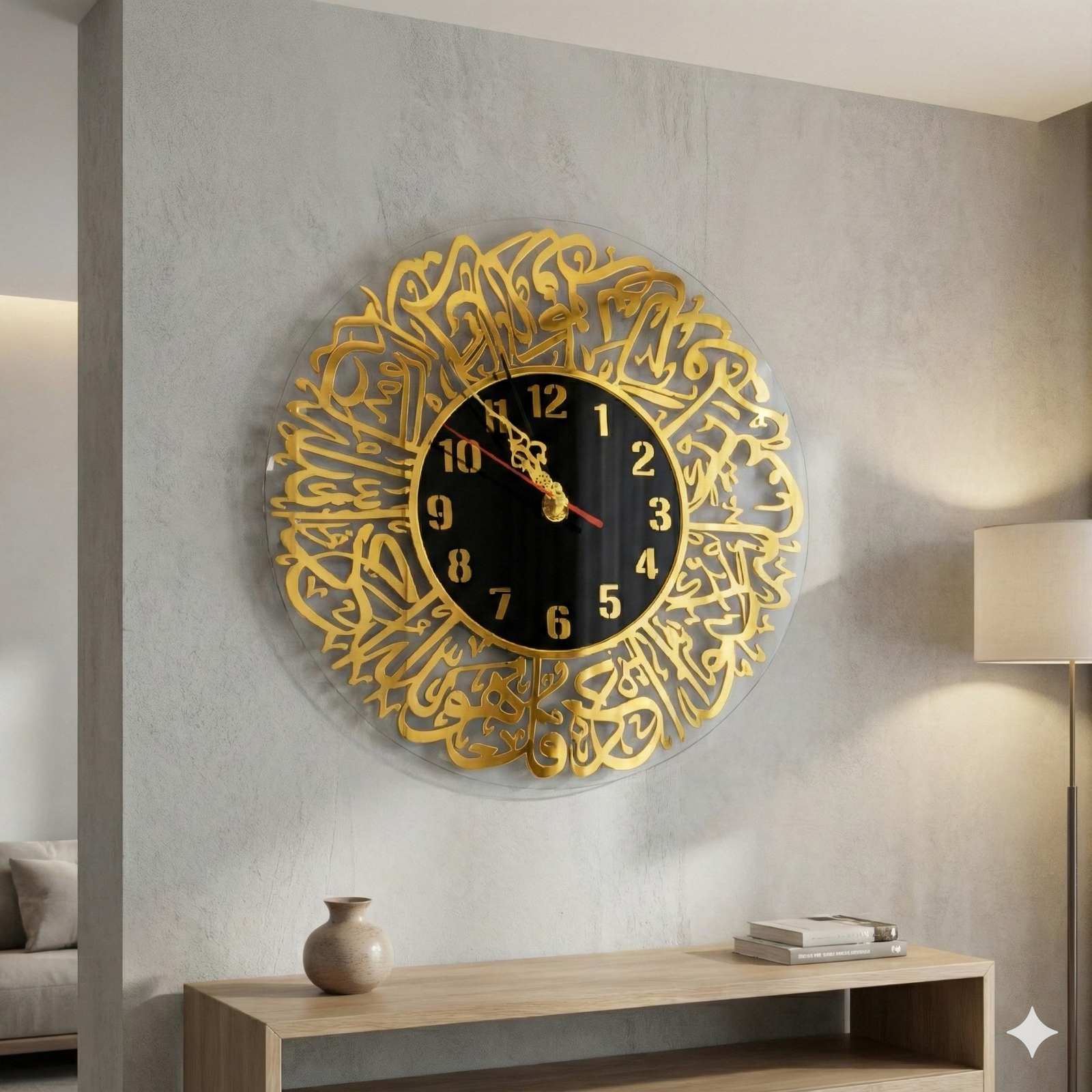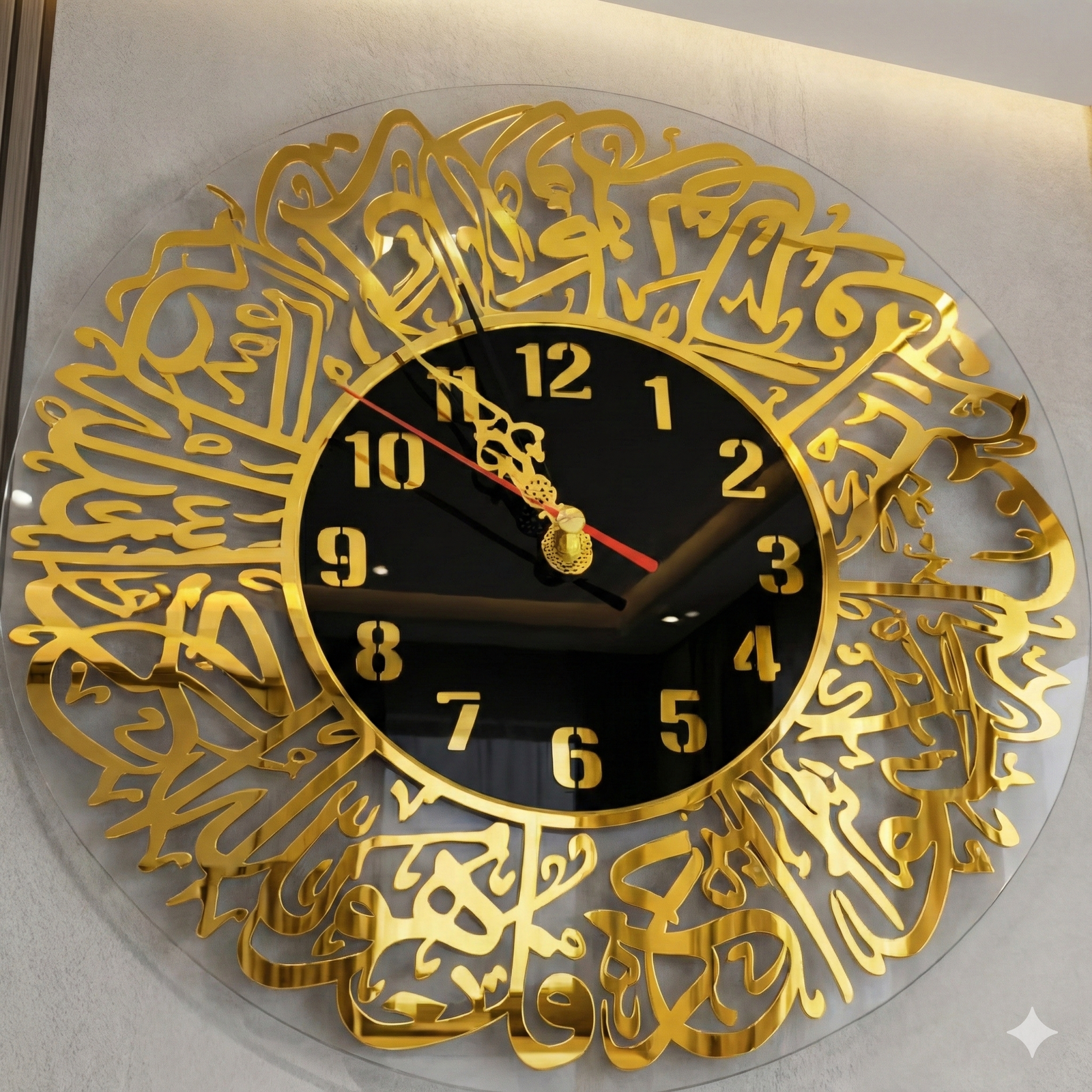 Add elegance and spiritual beauty to your space with this Luxury Golden Acrylic Islamic Wall Clock. Crafted from high-quality glossy acrylic, this clock features a stunning mirror-gold calligraphy design with a deep black center for a premium look. Perfect for modern homes, it blends faith, style, and functionality in one beautiful piece.