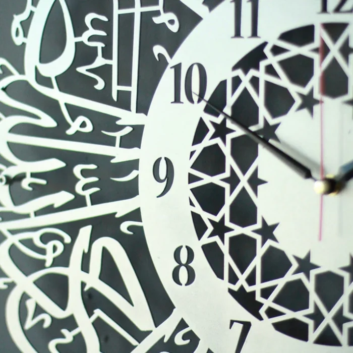 • Design: Features Surah Al-Ikhlas in beautifully detailed Arabic calligraphy, paired with a functional wall clock